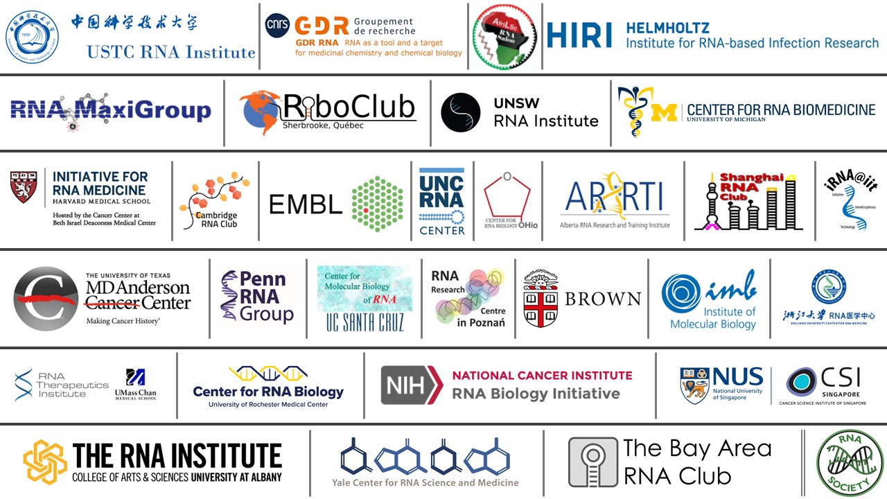 RNA Collaborative Seminar SeriesInformation and Upcoming SeminarsThe RNA Collaborative is a grassroots effort led by several of the RNA research centers worldwide to provide an online seminar series during and beyond the institutional shut-down caused by COVID-19. The goal of the program is to promote and disseminate emerging RNA research and to establish and strengthen connections within the international RNA scientific community. Scientists are welcome to present all RNA-related research spanning from foundational discoveries to potential therapeutic applications. Host centers can choose to present in a number of formats, including but not limited to: seminars co-hosted between two institutions that entail one 60-minute event (each institute presents a 30-minute seminar), four poster sessions with introductory lightning talks, or a combination of talks and poster sessions. All seminars are slotted for one hour. Seminars are held virtually on the second Wednesday of each month, at either 10:00 am ET (2:00 pm GMT) or 4:00 pm ET (8:00 pm GMT). Additional seminar dates will be added to accommodate increased membership. Each seminar will remain an hour long, but will be hosted by two member centers, each with 1-2 speakers. Seminars are recorded and made freely available for viewing on the RNA Collaborative YouTube Channel. Seminars are open for viewing by all interested researchers, but prior registration is required to access the streaming content. Current RNA Collaborative participating centers include: African Life Science RNA Salon, Alberta RNA Research and Training Institute (ARRTI), Cambridge RNA Club, European Molecular Biology Laboratory (EMBL), Groupe de Recherche RNA, Harvard Medical School Initiative for RNA Medicine, Helmholtz Institute for RNA-based Infection Research, Institute of Molecular Biology (IMB), Istituto Italiano di Tecnologia (IIT), MD Anderson Center for RNA Interference and Non-Coding RNAs, NCI RNA Biology Initiative, NUS-CSI Singapore RNA Biology Center, Penn Institute for RNA Innovation, RiboClub Sherbrooke, RNA MaxiGroup, University of Wisconsin-Madison, RNA Research Centre in Poznan, Shanghai RNA Club, The Bay Area RNA Club (BARC), The Brown RNA Center (BRC), The RNA Institute, University At Albany, UCSC Center for Molecular Biology of RNA, UMass Chan Medical School, RNA Therapeutics Institute, University of Michigan Center for RNA Biomedicine, University of North Carolina RNA Research Group, Ohio State University Center for RNA Biology, University of Rochester Center for RNA Biology, University of Science & Technology of China (USTC) RNA Institute, UNSW RNA Institute, Yale Center for RNA Science and Medicine and Zhejiang University (ZJU) Center for RNA Medicine We invite institutions with RNA research programs to join the RNA Collaborative and present within this exciting on-line seminar series. All below are free and open to the public. For more information on having your center join the RNA Collaborative, please contact Stacey O’Neil [email protected]. ![]()