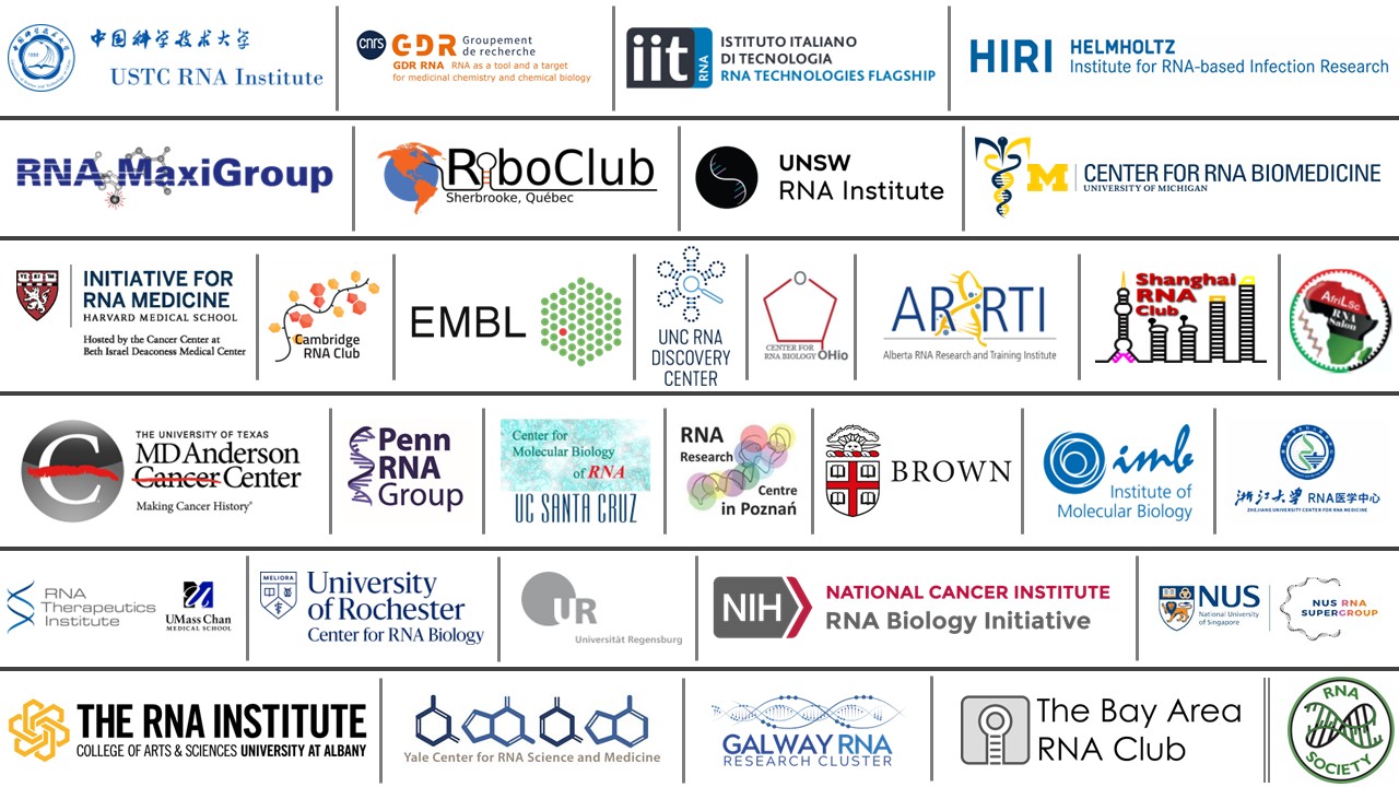 Current RNA Collaborative participating centers include: African Life Science RNA Salon, Alberta RNA Research and Training Institute (ARRTI), The Bay Area RNA Club (BARC), The Brown RNA Center (BRC), Cambridge RNA Club, European Molecular Biology Laboratory (EMBL), Groupe de Recherche RNA, Galway RNA Research Cluster, Harvard Medical School Initiative for RNA Medicine, Helmholtz Institute for RNA-based Infection Research, Institute of Molecular Biology (IMB), Istituto Italiano di Tecnologia (IIT), MD Anderson Center for RNA Interference and Non-Coding RNAs, NCI RNA Biology Initiative, NUS-CSI Singapore RNA Biology Center, Penn Institute for RNA Innovation, RiboClub Sherbrooke, RNA MaxiGroup, University of Wisconsin-Madison, RNA Research Centre in Poznan, Shanghai RNA Club, The RNA Institute, University At Albany, UCSC Center for Molecular Biology of RNA, UMass Chan Medical School, RNA Therapeutics Institute, University of Michigan Center for RNA Biomedicine, University of North Carolina RNA Research Group, Ohio State University Center for RNA Biology, Regensburg Center for Biochemistry (RCB), University of Rochester Center for RNA Biology, University of Science & Technology of China (USTC) RNA Institute, UNSW RNA Institute, Yale Center for RNA Science and Medicine, and Zhejiang University (ZJU) Center for RNA Medicine