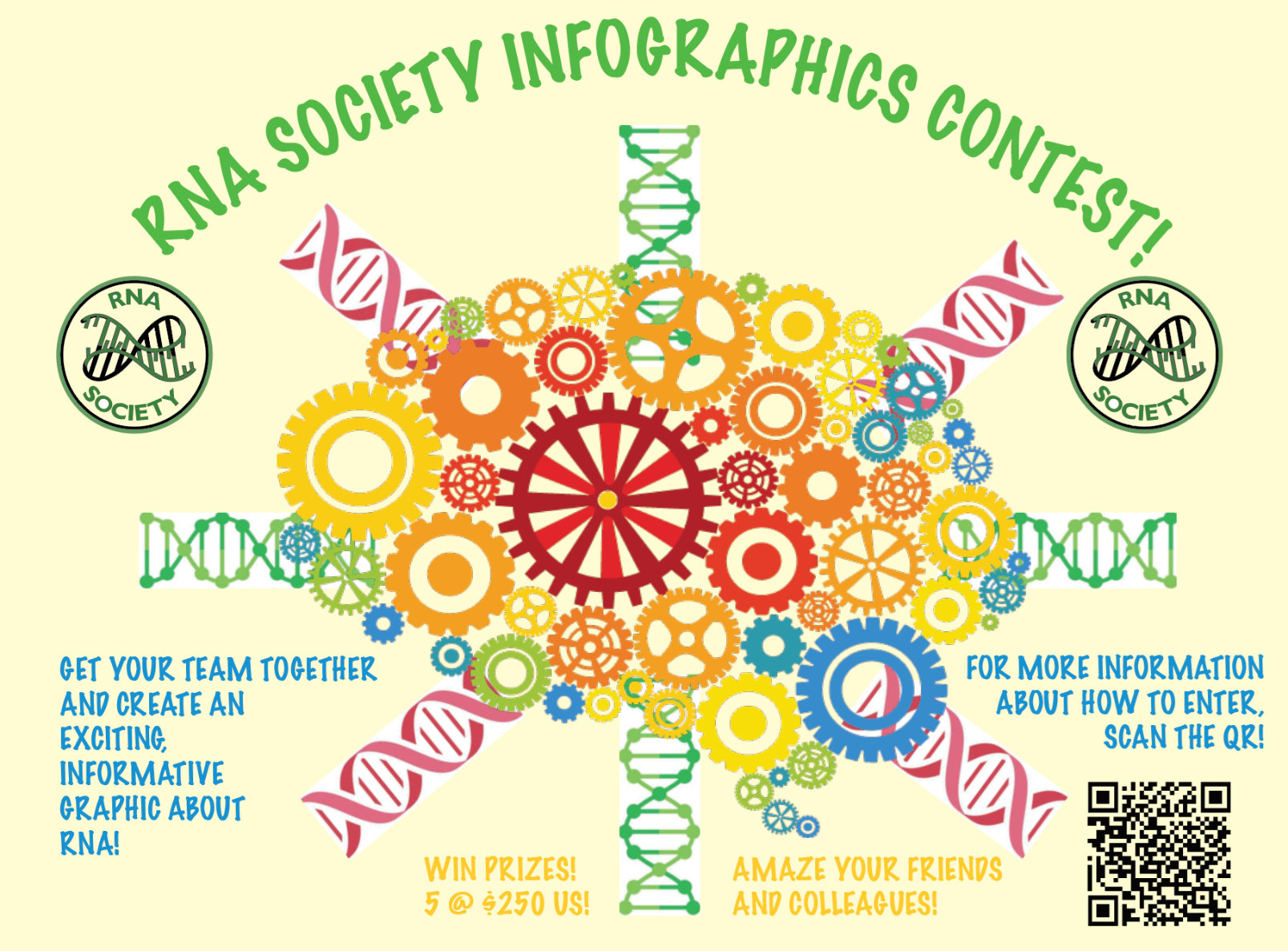 Submissions must be original and owned by the submitter, as the RNA Society will request a nonexclusive license for reuse and dissemination at future meetings, public outreach events, and in published materials. Contributions will be evaluated, and five cash prizes of $250.00 US will be awarded to the most creative and informative submissions. Winning creators will be acknowledged whenever and wherever their infographic is displayed, affording them recognition as public educators. Submissions from either individuals or teams are encouraged and membership in the Society, while encouraged, is not required to submit an entry.